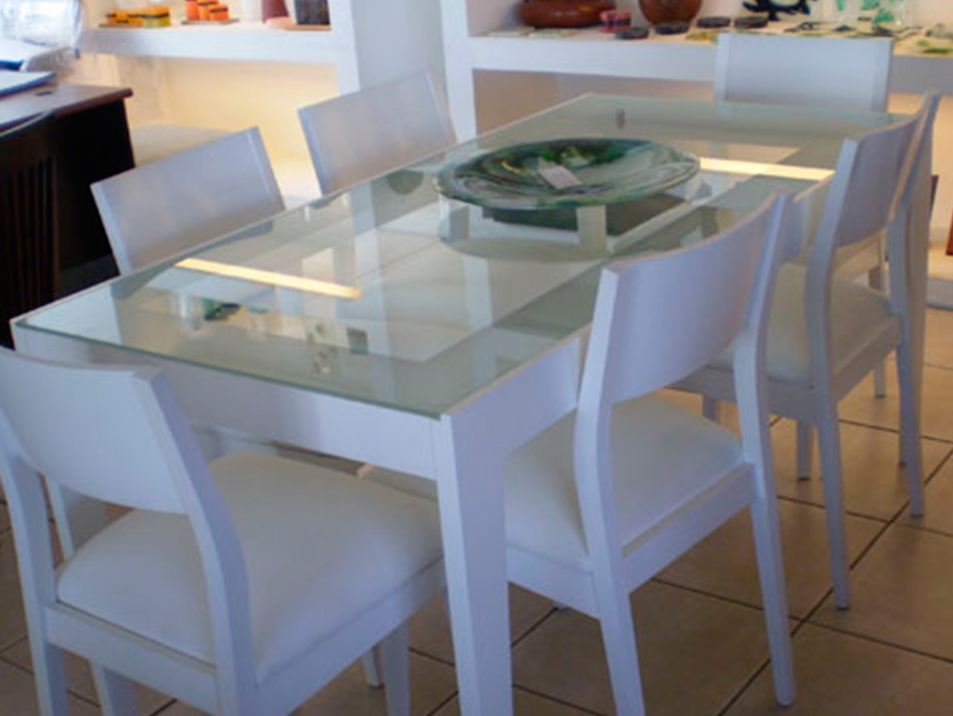 MESA PIE CUBO CON RANURA Y VIDRIO Y SILLAS BELEN